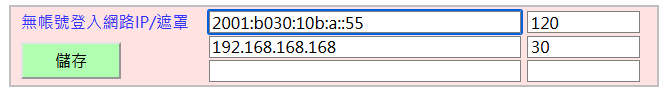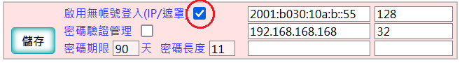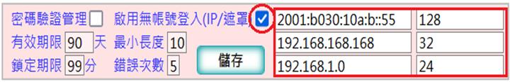 當勾選啟用無帳號登入[IP/遮罩]時: