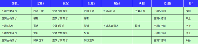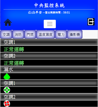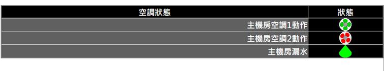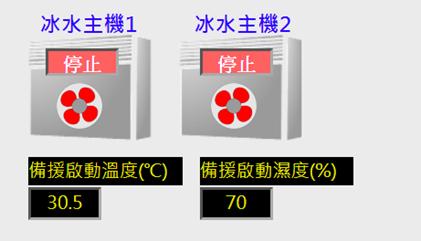 顯示空調機、冰水主機的狀態,運轉時為綠色,扇葉旋轉;停止時為紅色,扇葉不旋轉。圖示可自行更改