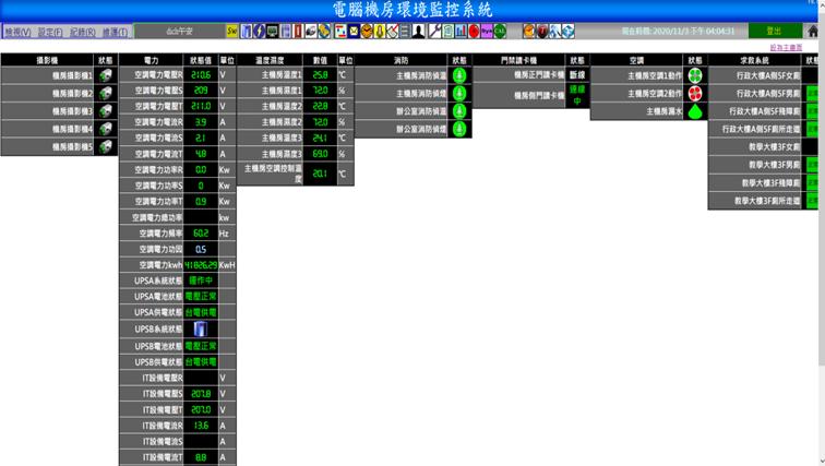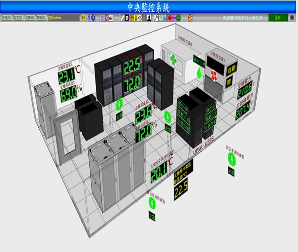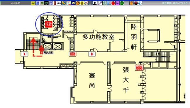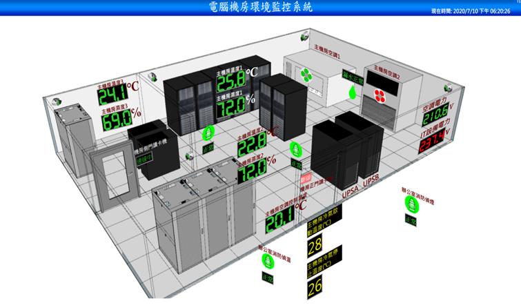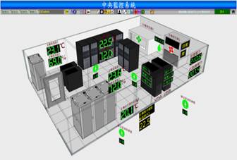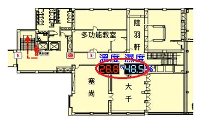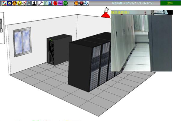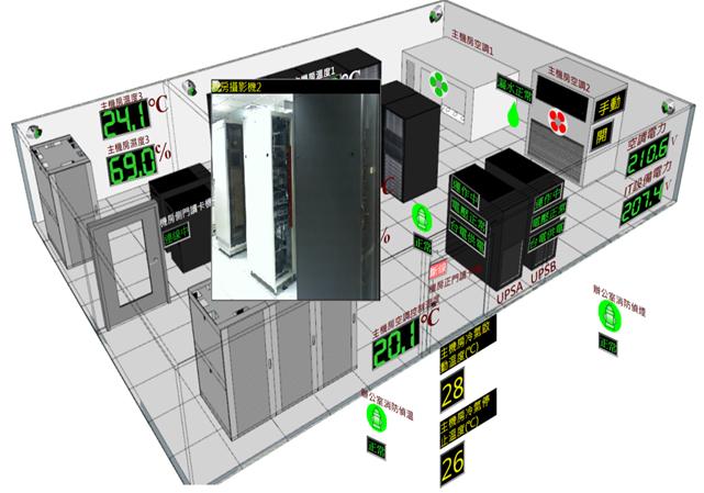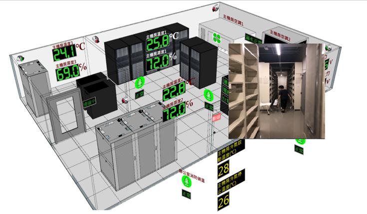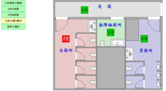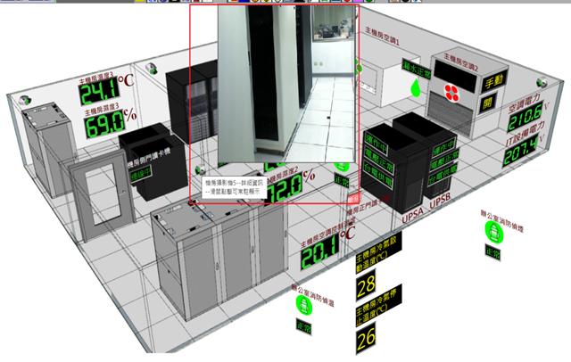 以區域平面圖呈現,顯示監控區域空氣品質、溫度濕度、求救系統、燈光控制、監視影像畫面、空調系統、門禁系統、不斷電系統、電力資訊等資訊
