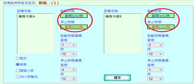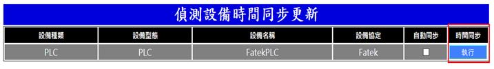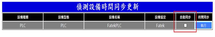 可設定偵測設備[如:PLC、DDC、計費電表、資料收集器等]時間自動與系統時間同步勾選欲同步時間之設備右側之「自動同步」,則該設備每周日將與系統時間同步一次