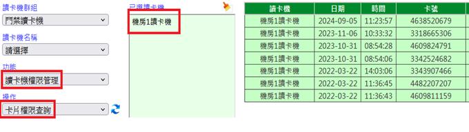 查詢指定之讀卡機內所有卡片之權限