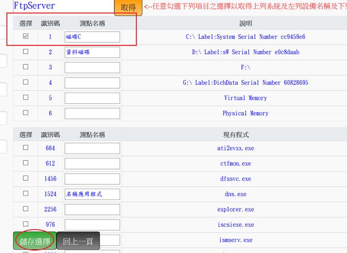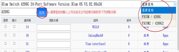 若同一IP原系統有1個以上之系統點,則右方下拉式視窗則可選擇不同之系統點。可點選右方下拉式視窗,並點擊「取得」後下方將會出現原有設定值及測點名稱