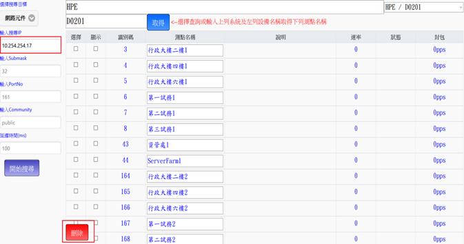 開始搜尋後,當輸入之IP無法連線時,而之前曾建立過相同IP之測點將會顯示,且出現刪除按鈕,可將測點全部刪除